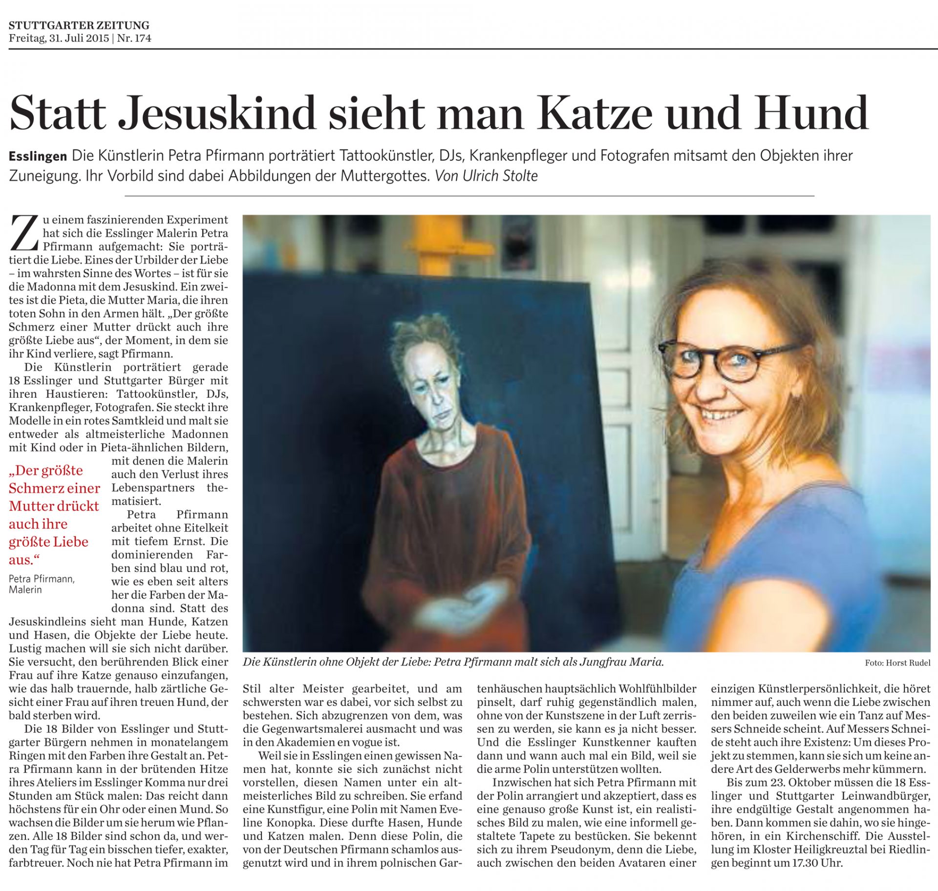 Petra Pfirmann arbeitet ohne Eitelkeit mit tiefem Ernst. Die dominierenden Farben sind blau und rot, wie es eben seit alters her die Farben der Madonna sind. Statt des Jesuskindleins sieht man Hunde, Katzen und Hasen, die Objekte der Liebe heute. Lustig machen will sie sich nicht darüber. Sie versucht, den berührenden Blick einer Frau auf ihre Katze genauso einzufangen, wie das halb trauernde, halb zärtliche Gesicht einer Frau auf ihren treuen Hund, der bald sterben wird.