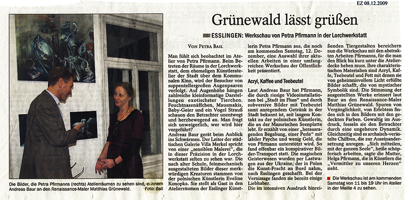 Laut Andreas Baur hat Pfirmann, die durch riesige Videoinstallationen bei „Stadt im Fluss“ und durch subversive Bilder mit Teebeutel samt anregendem Getränk in der Stadt bekannt ist, seit langem Kontakt zu der polnischen Künstlerin, die an der Masurischen Seenplatte lebt. Er erzählt von einer „herausragenden Begabung, einer Perle“ mit labiler Psyche und wenig Geld, die von Pfirmann unterstützt wird. So fand offenbar ein konspirativer Bilder-Transport statt. Die magischen Geisterwesen wurden per Lastwagen aus der Ukraine, der in Polen die Kunst-Fracht an Bord nahm, nach Esslingen geschafft. Bei der Vernissage fanden sie bereits einige Liebhaber.